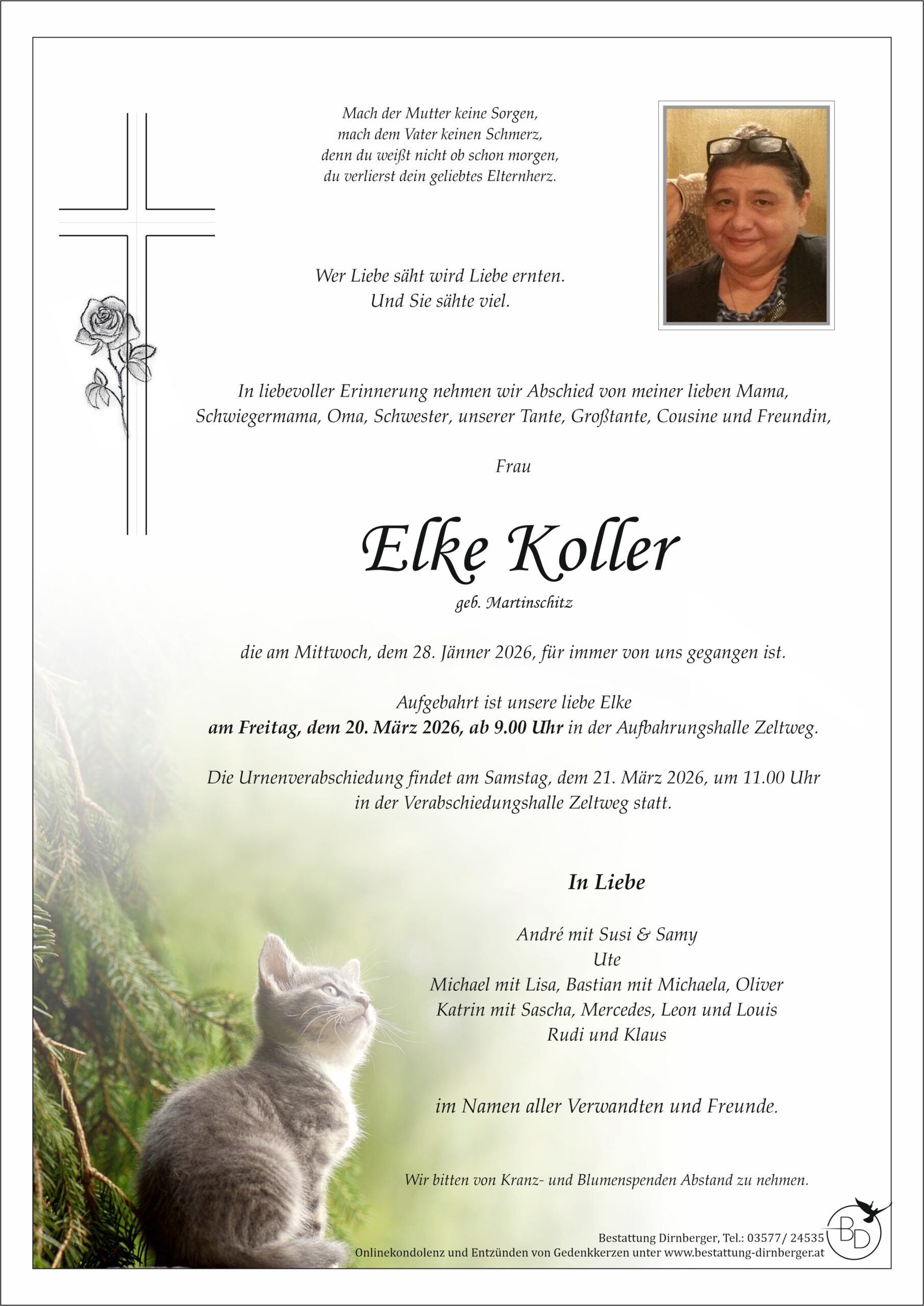 Aufbahrung: am Freitag, dem 20. März 2026 ab 9 Uhr – Aufbahrungshalle Zeltweg Urnenverabschiedung: am Samstag, dem 21. März 2026 um 11 Uhr – Verabschiedungshalle Zeltweg